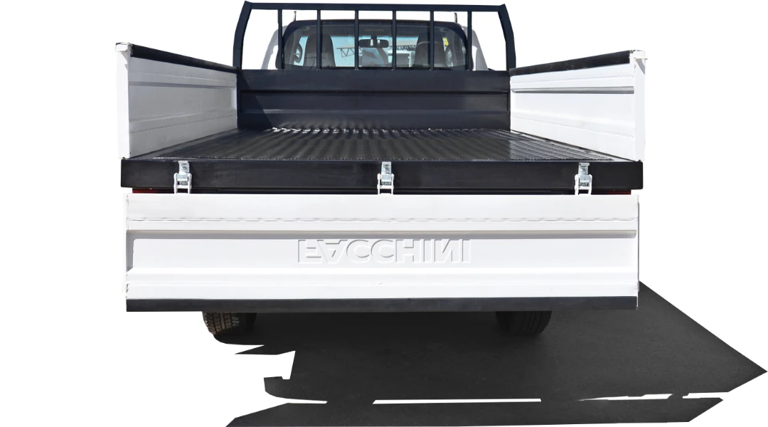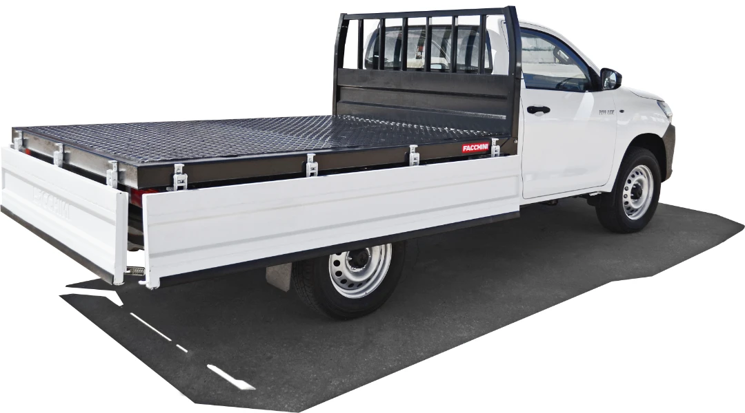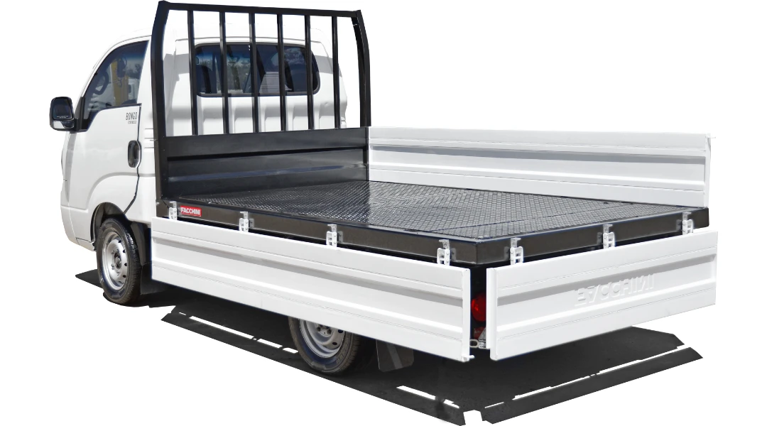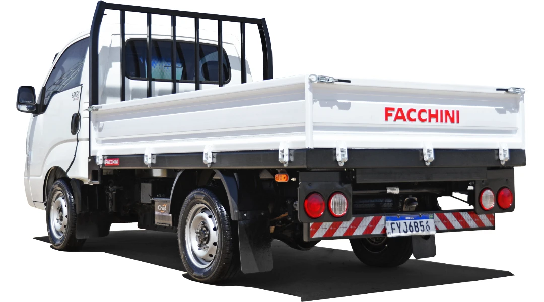 Assoalho: Chapa de aço xadrez com soldas sistema Mig automático e pontos de amarração interno.