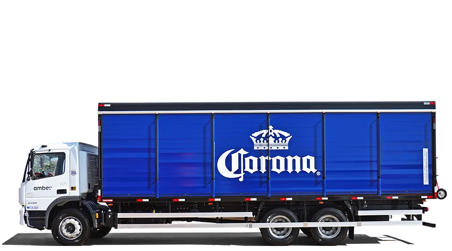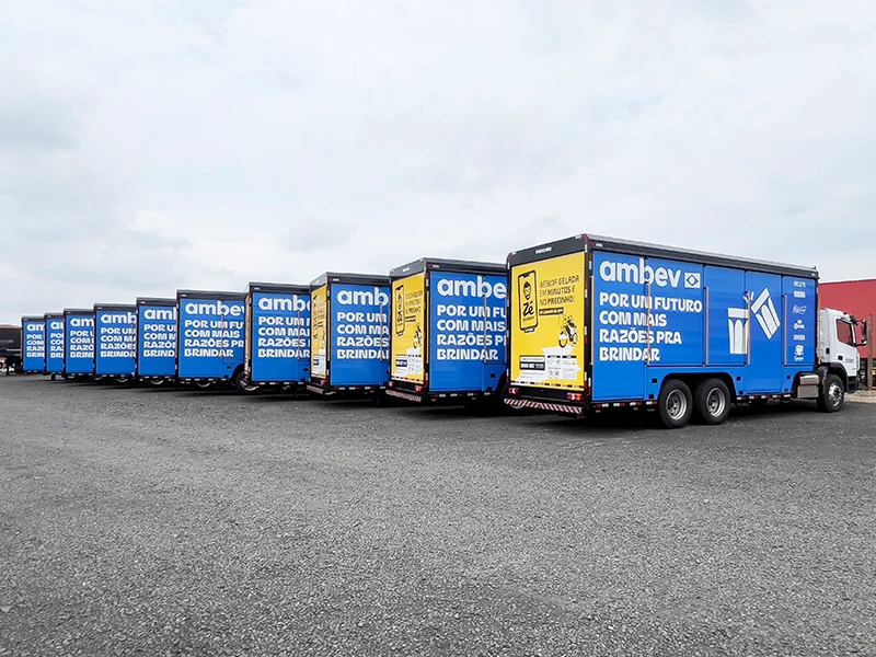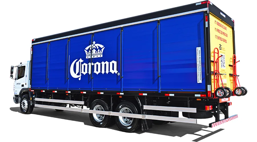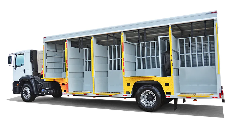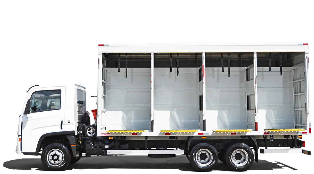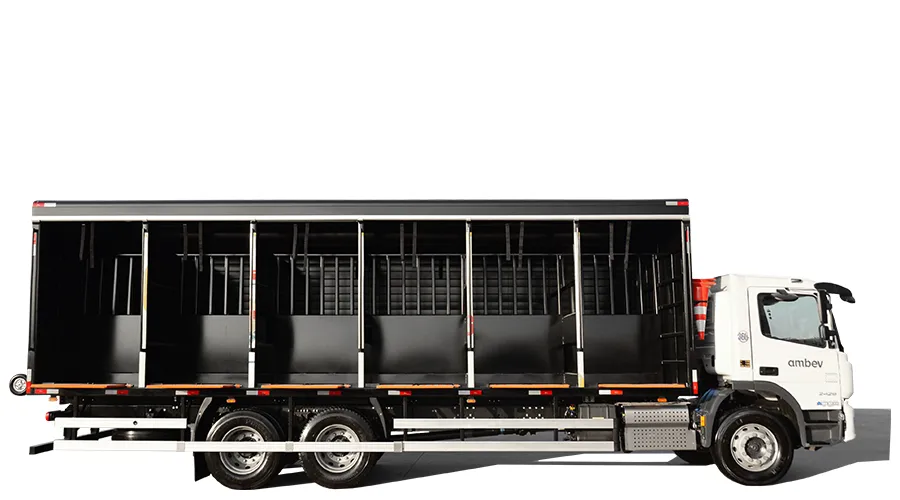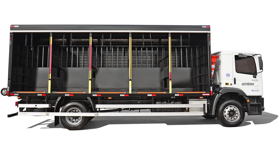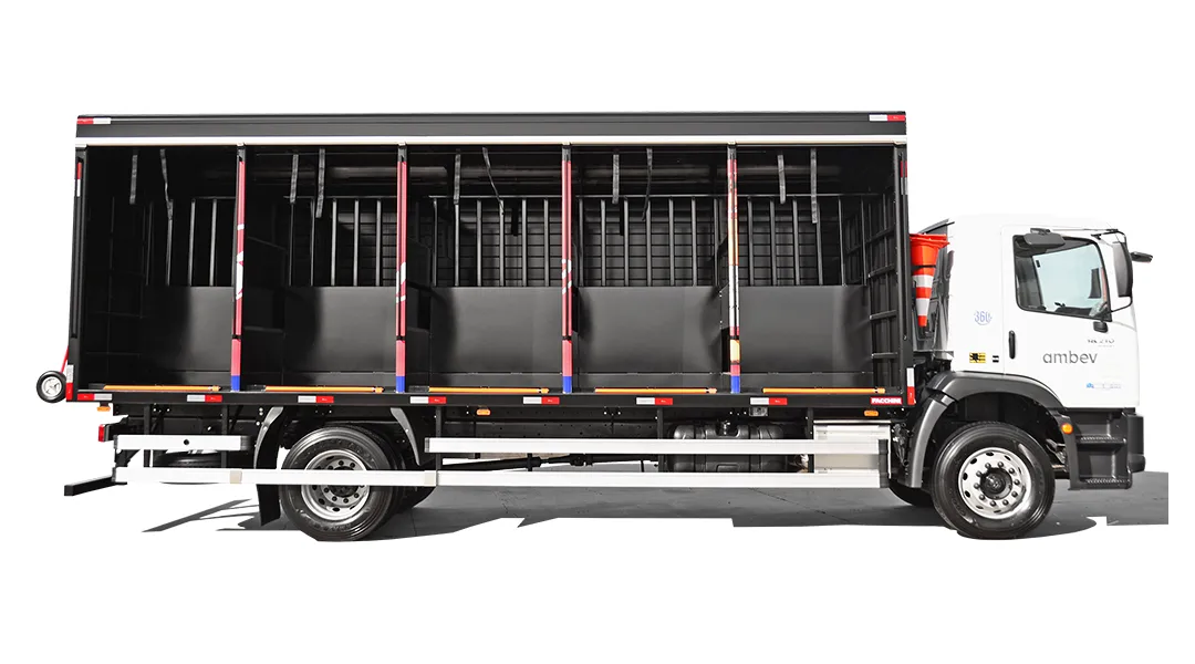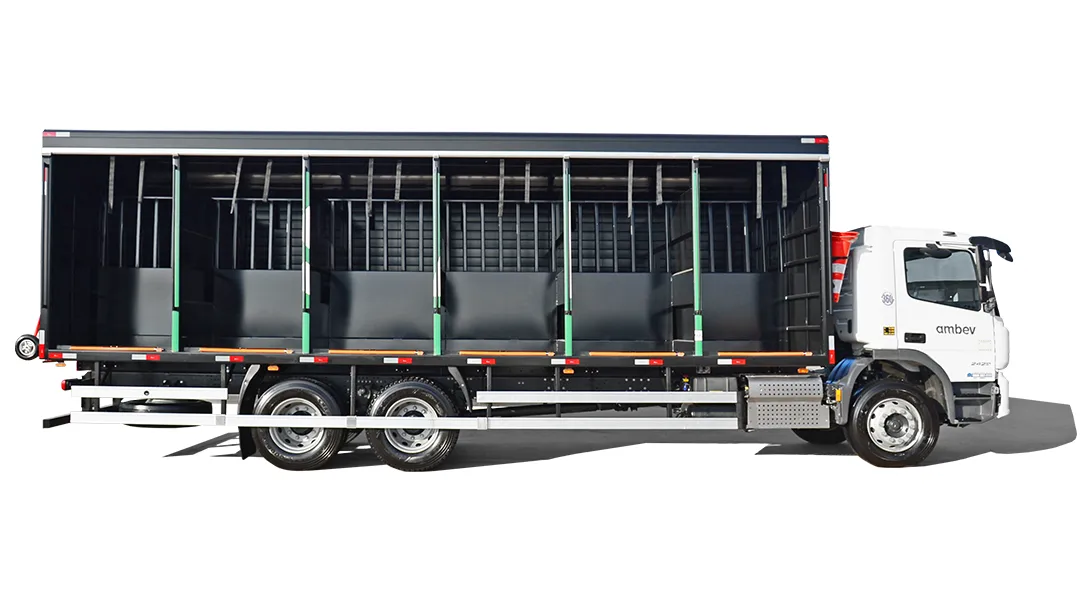 Estrutura longitudinal apoiada diretamente no chassi do veículo e perfis transversais tubulares nas extremidades de cada baia, conferindo rigidez adequada aos esforços transmitidos pelo peso.