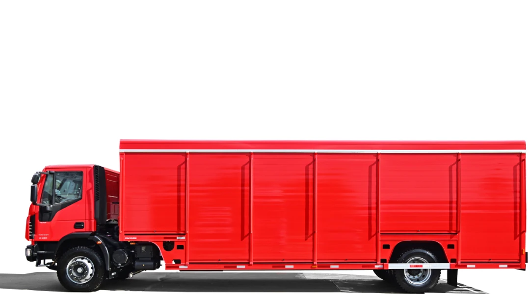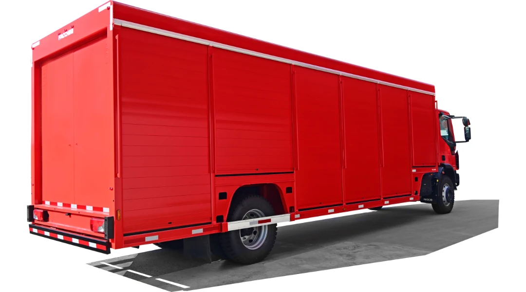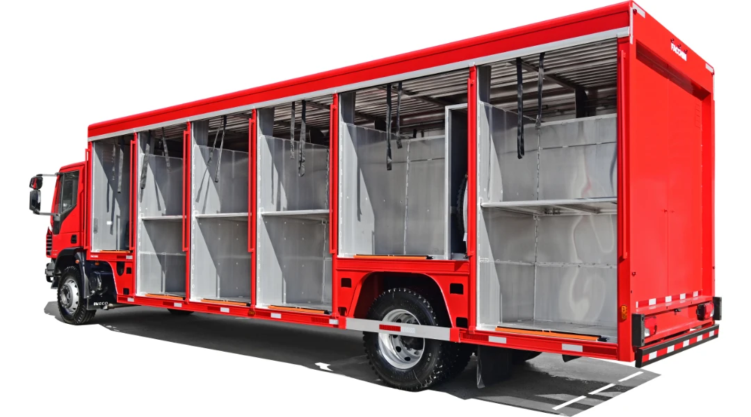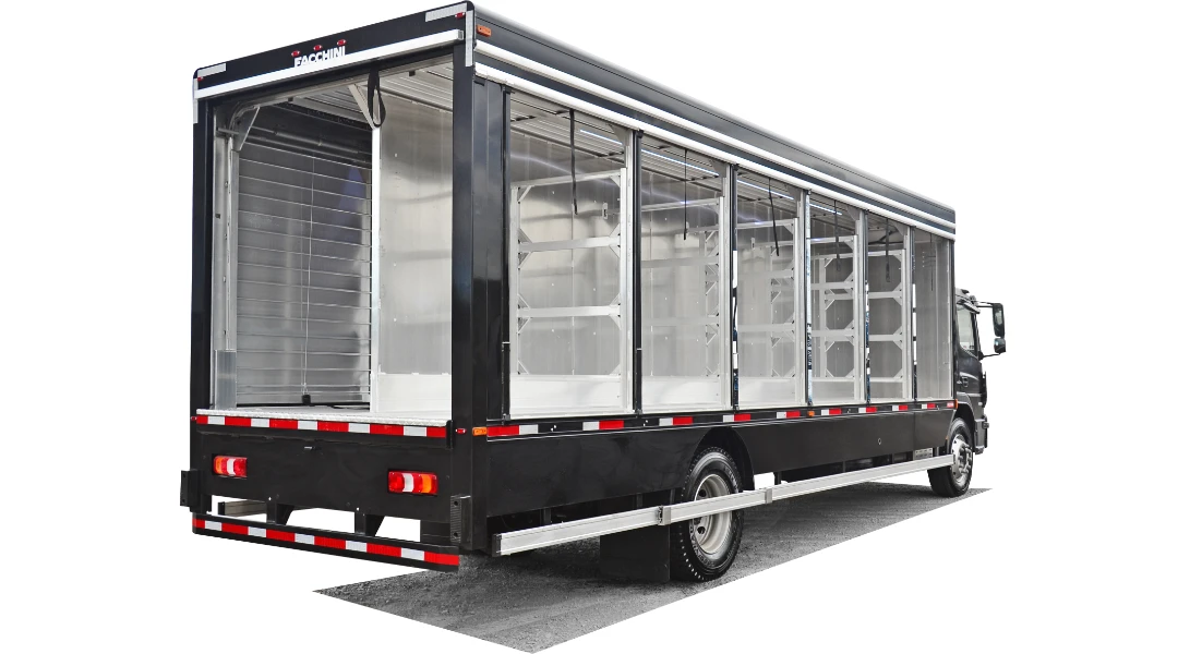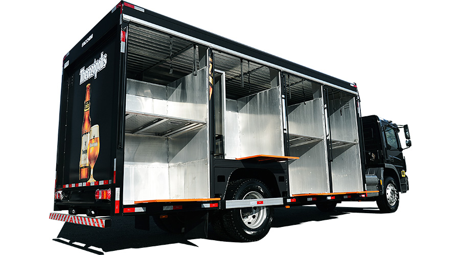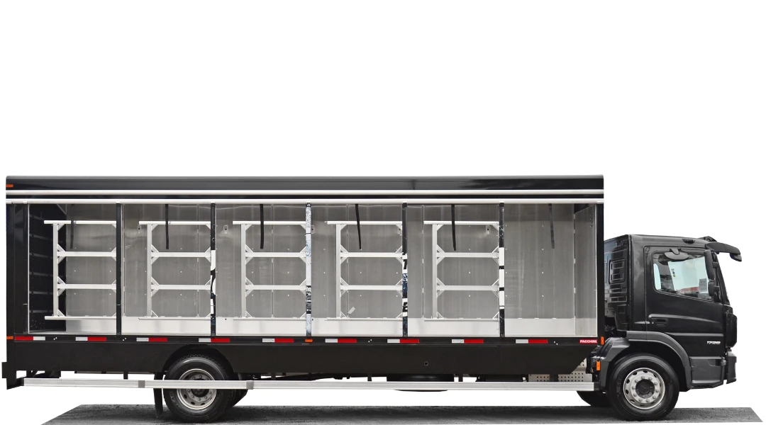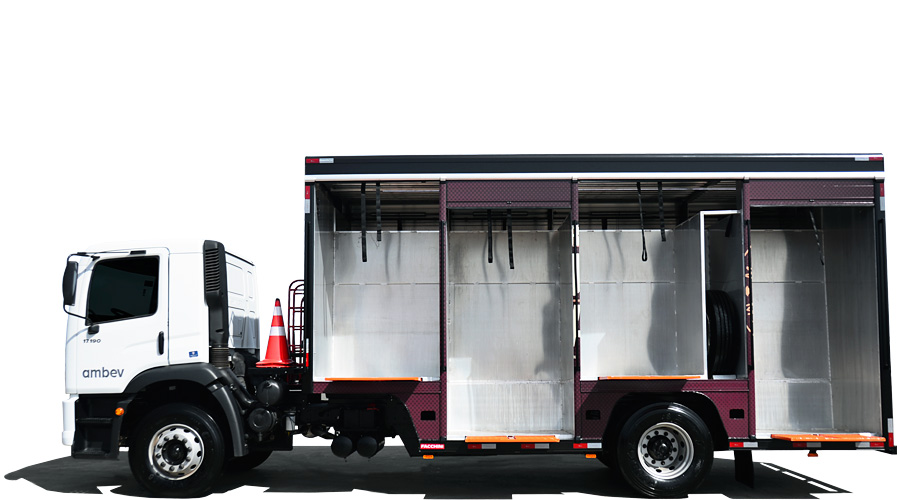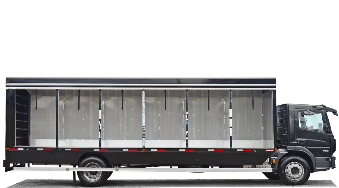 Em chapa de alumínio vincada 3.0mm maximizando o espaço interno disponível para carga.