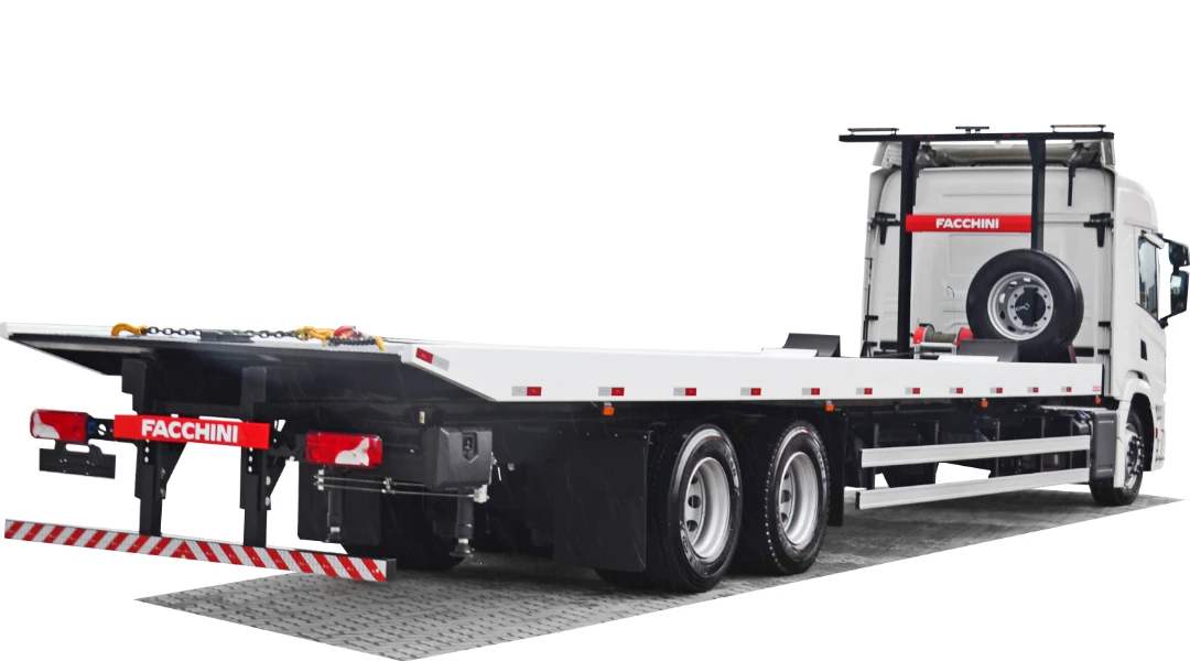Sinalizador luminoso Led Flash Light; 01 barra de luz em Led 60 W para trabalhos noturnos; corote plástico de água; caixa plástica de ferramentas; para-lamas plástico com para-barros de borracha; sinaleiras laterais; 04 calços para as rodas dianteiras, sendo 02 calços para veículos de porte pequeno e 02 calços para caminhões; 08 cintas de nylon com catraca para prender as rodas do veículo transportado; 01 patesca capacidade 10.000 Kg.
