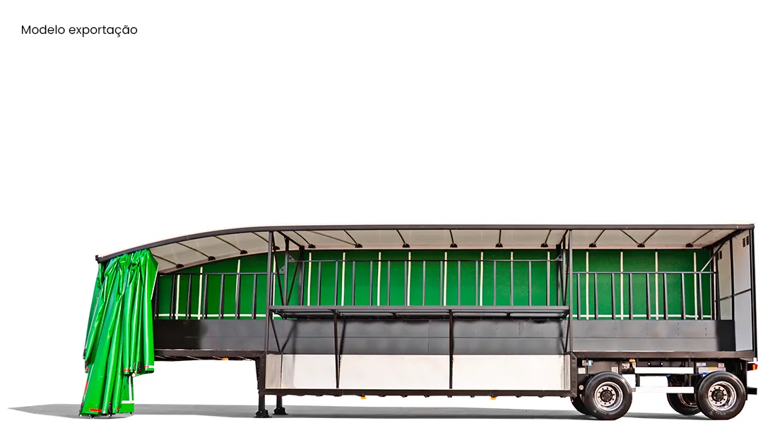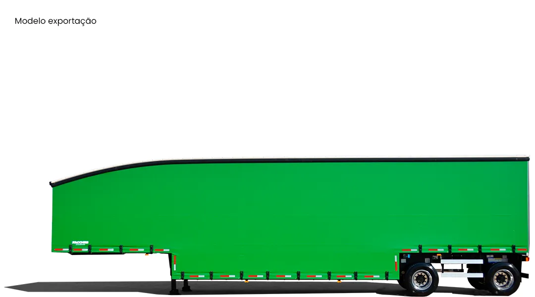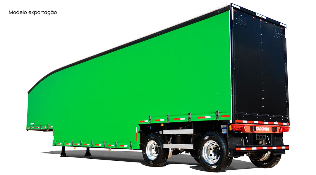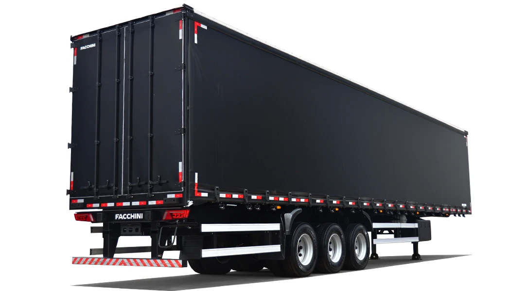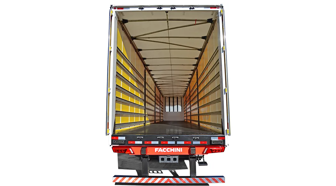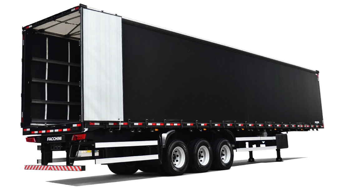 Laterais: Em lona vinílica reforçada, sustentada por rodízios e tracionadas longitudinalmente pela traseira através de catracas de maior eficiência e facilidade de manuseio e na vertical por catracas de polietileno. 3 colunas móveis de aço com alças por lateral, de fácil manuseio e 2 travas de contenção de carga por vão encaixadas em pino para maior segurança.