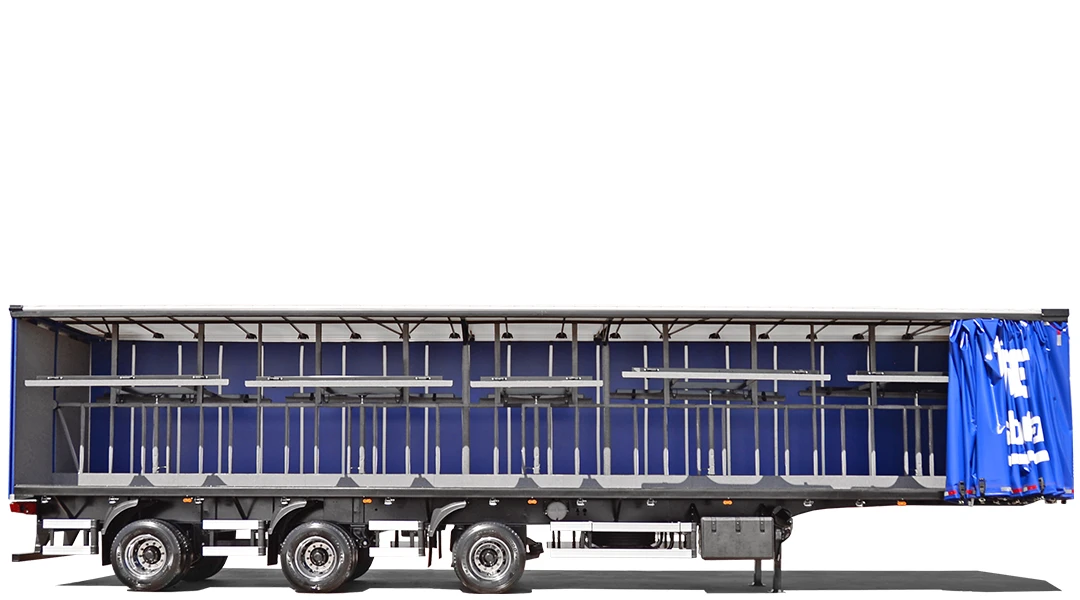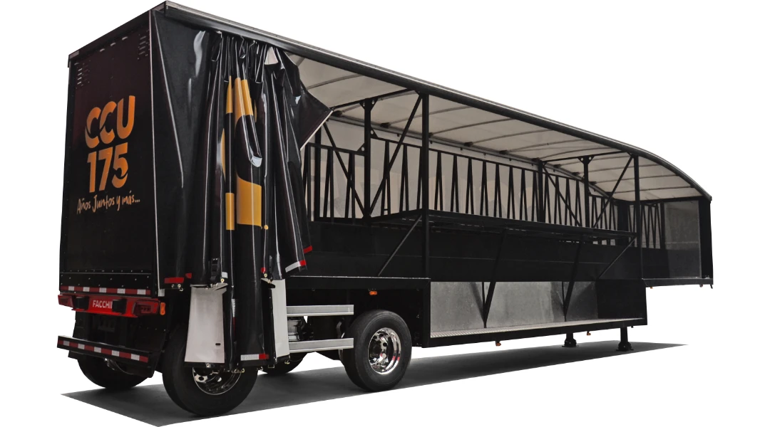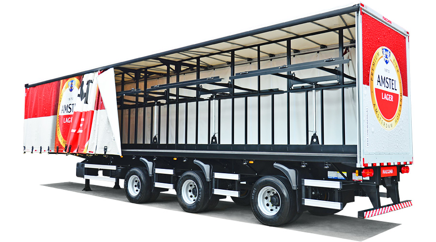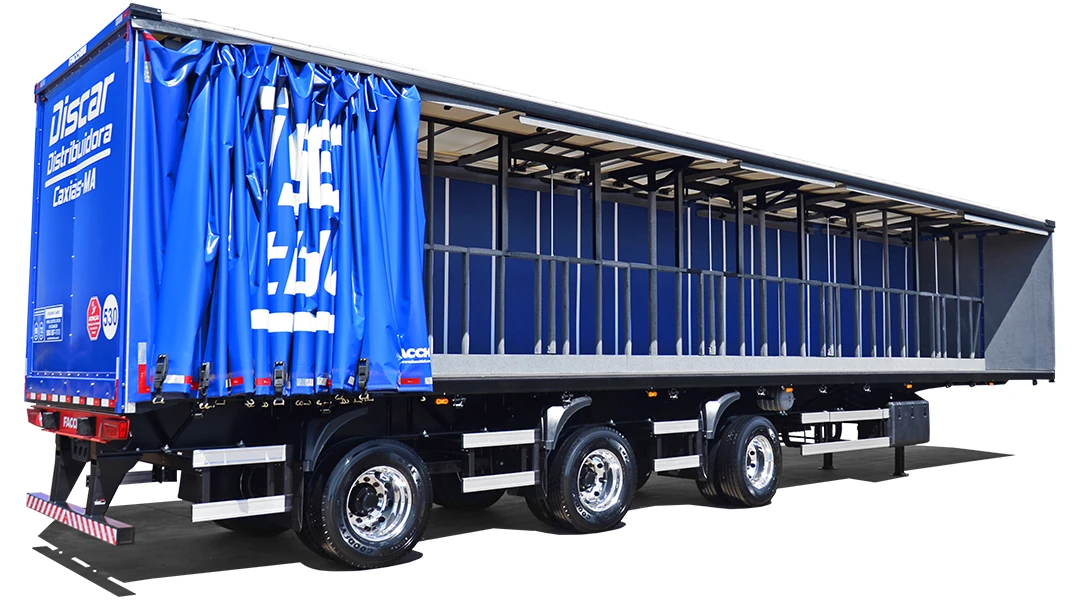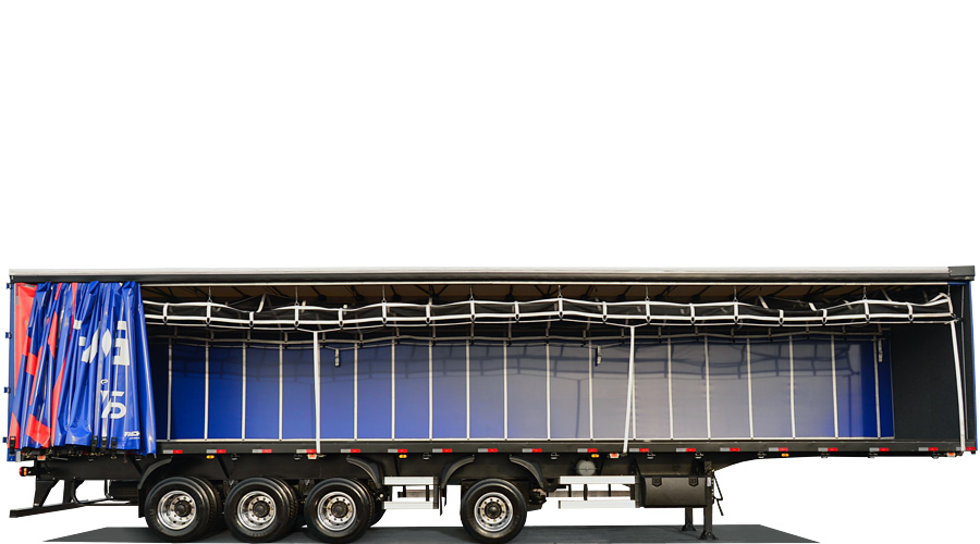 Laterais: Lona vinílica reforçada, sustentada por rodízios e tracionadas longitudinalmente pela dianteira e na vertical por catracas de polietileno, trazendo mais praticidade e maior eficiência no manuseio.